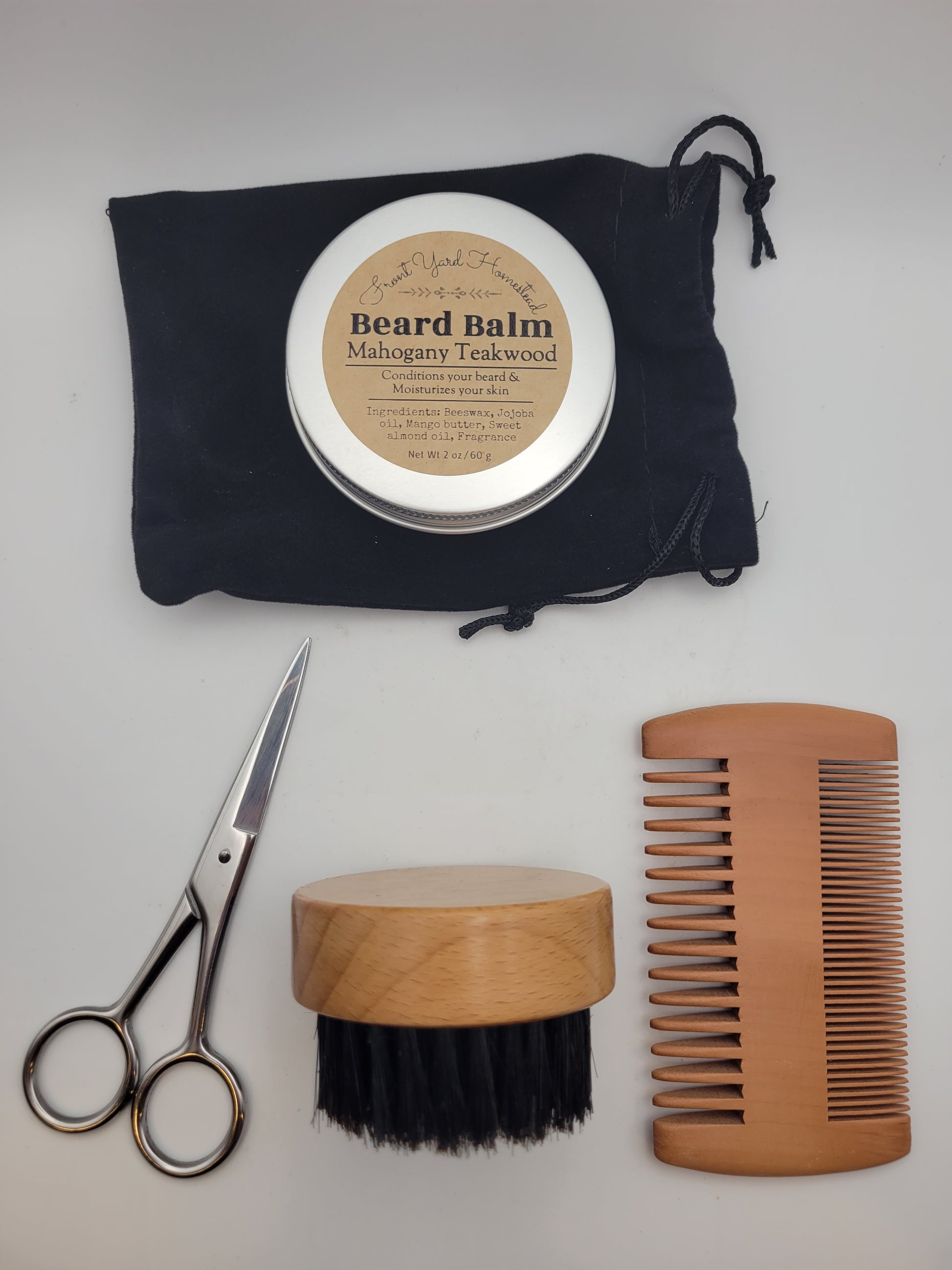 This beard care kit has everything you need to care for your beard in a convenient carrying case. It includes a beechwood and boar bristle brush, wood comb with two different teeth shapes, and a pair of stainless steel scissors for trimming unwanted hairs. Add any beard balm and get a $2.00 discount, shown in shopping cart!