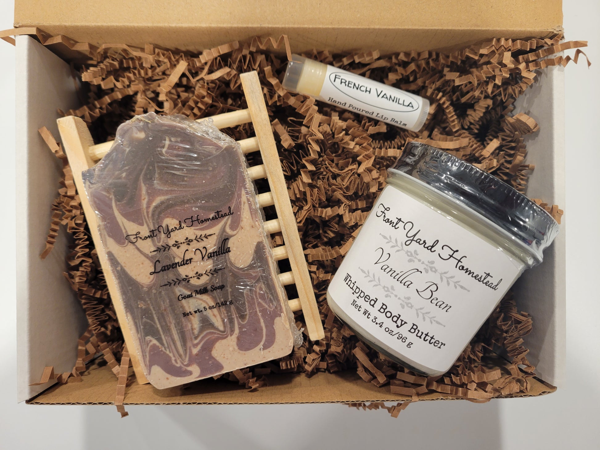 For the vanilla lovers, this set includes some of our vanilla-themed products sold at a discount! Included in the box are three full-sized products as well as a bamboo soap dish.